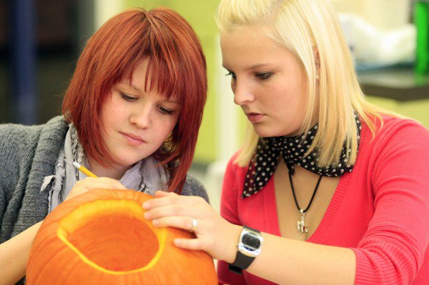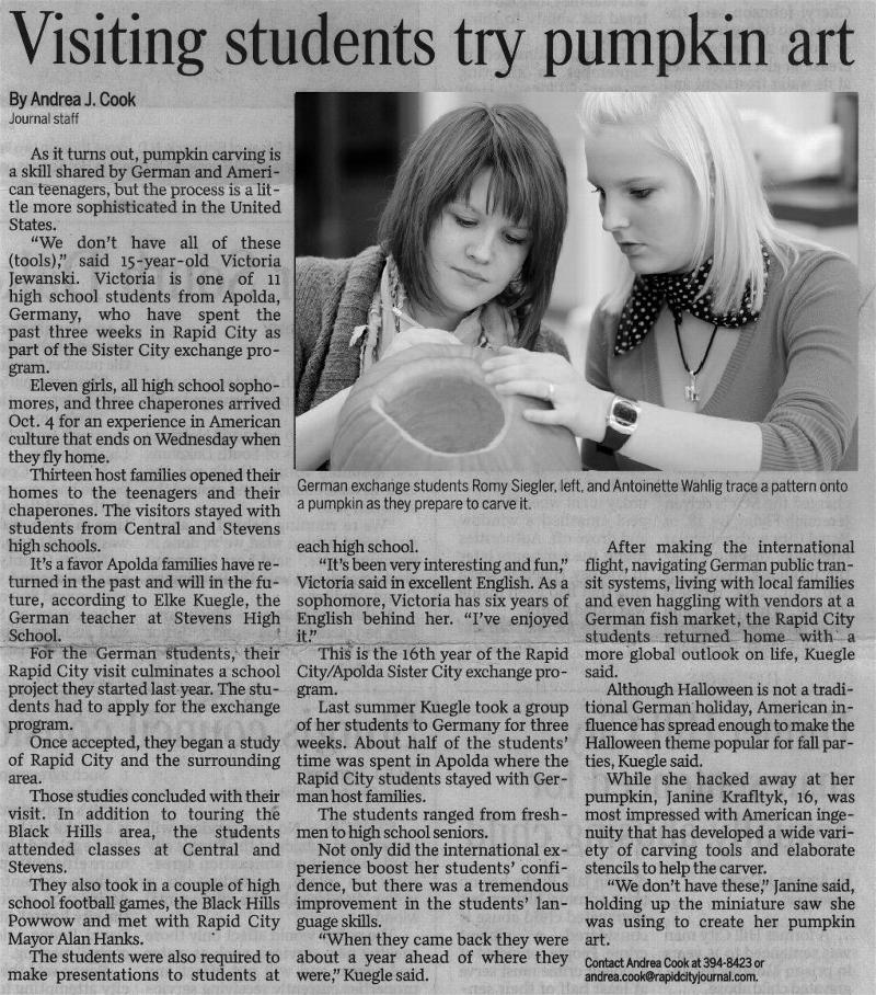 Der Montag der letzten Woche war recht nett. Ich habe einen großen Test in Anatomie&Physiologie geschrieben und habe ein gutes Gefühl, dass dieser ziemlich gut gelaufen ist. Nach der Schule habe ich mit den Schülerinnen aus Apolda Kürbisse ausgehöhlt. Die Presse war auch da und hat diesen Artikel in der Zeitung abgedruckt: