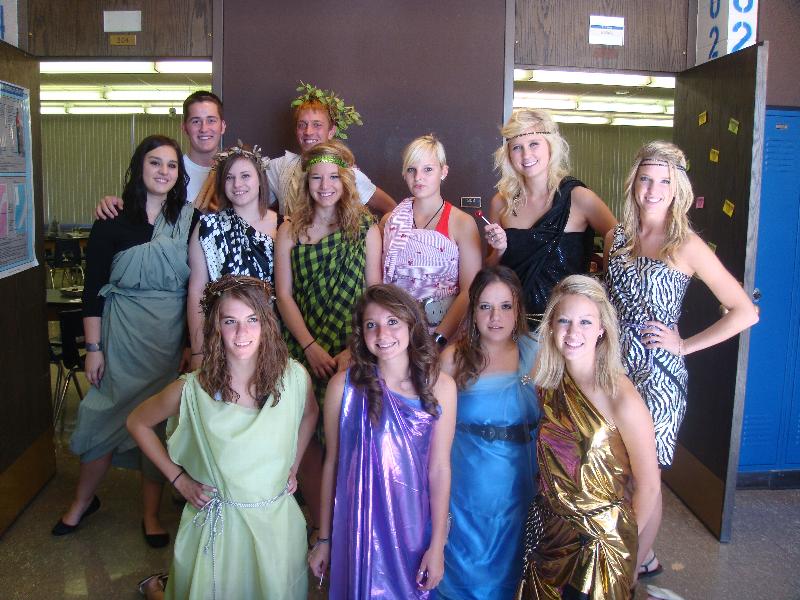 Am Donnerstag musste jeder die Farbe der Klassenstufe tragen. Das bedeutet 9.Klasse grün, 10.Klasse gelb und 11.Klasse lila. Die 12.Klasse musste eine Toga tragen (Farbe war egal). Da ich hier als 12.-Klässler eingestuft wurde habe ich auch den Spaß gehabt mir eine Toga anzulegen. Ich habe mir einen rot-weiß gestreiften Stoff mit roten Kirschen ausgesucht, diesen um meinen Körper gewickelt und mit nur 3 Sicherheitsnadeln befestigt. Das sah echt chic aus.