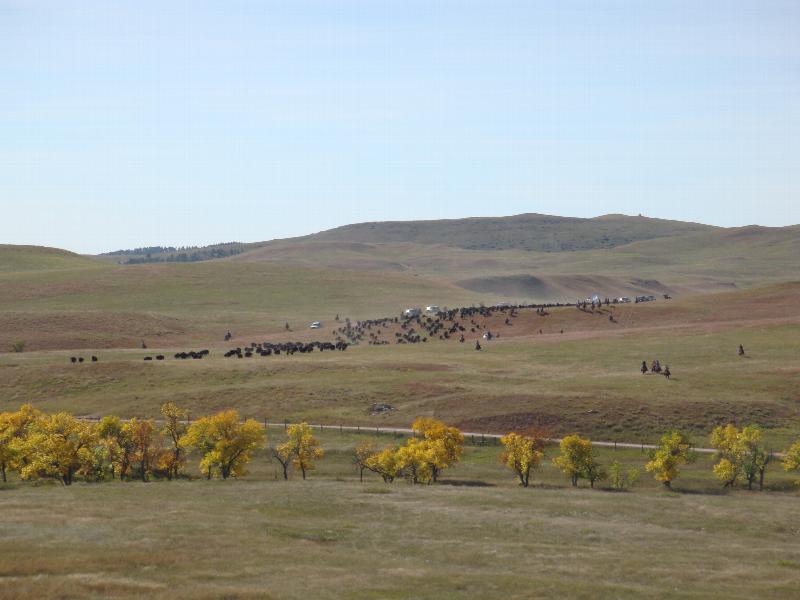 Der Rest verlief recht schnell. Cowboys auf Pferden und in Autos haben die Büffel in einer Herde voran getrieben. Es sah toll aus wie die schwarzen Punkte zu einem großen schwarzen Fleck zusammenwuchsen und sich so über die Hügel ihren Weg zu dem eingezäunten Bereich suchten. Als der Fleck als einzelne Tiere erkennbar wurde (für mich ohne Brille ca. 300 m Entfernung) konnte man ein Donnergrollen hören. Es war allerdings keine Gewitterwolke zu sehen. Das Galoppieren der 1300 Büffel erzeugte dieses Geräusch. Das war echt cool.