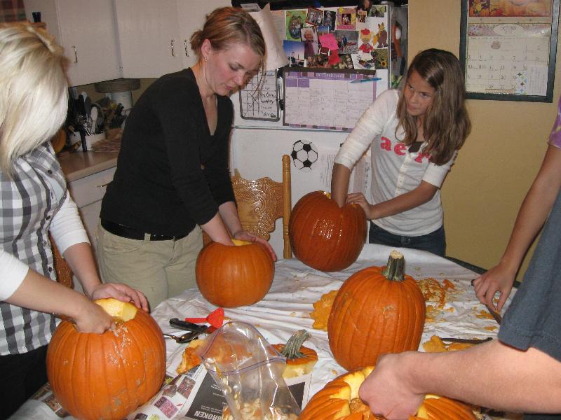 Am Montag waren wir bei Freunden von Sean und Kari und haben Kürbisse ausgeschnitzt. Das hat länger gedauert als ich dachte, weil man in Amerika nicht einfach nur ein Gesicht mit einem Messer ausschneidet, sondern mit filigranen Sägen detaillierte Bilder aussägt.