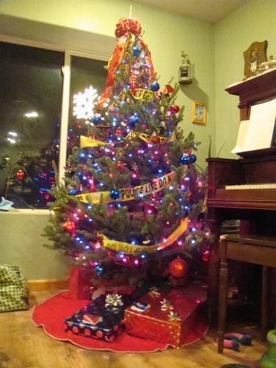Am Montag haben wir dann den anderen Weihnachtsbaum mit Polizei-ornamenten behangen. Mit „anderen Baum“ meine ich den echten Tannenbaum, den wir gekauft haben. Kari hatte sich überlegt, dieses Jahr einen "Polizeibaum" zu machen. Sie hat verschiedene rote und blaue Lichter und rote und blaue Kugeln besorgt und hat mit mir die über die Jahre gesammelten Polizeiornamente an den Baum gehängt. Außerdem hat sie Sean’s „DO NOT CROSS“- Absperrband als Girlande benutzt. Der Baum sieht echt schön aus. Danach haben wir unser angefangenes Lebkuchenhäuschen verziert und ansehnlich gemacht.
